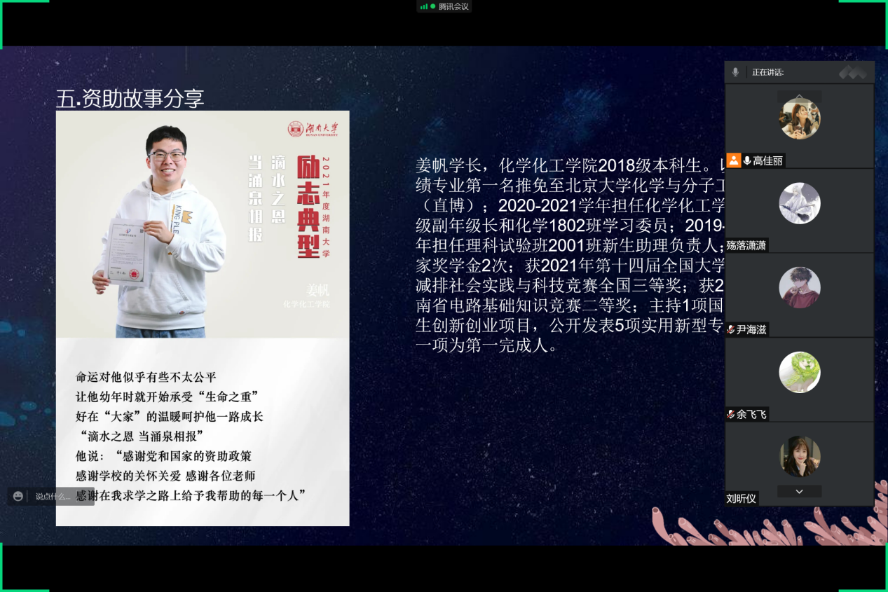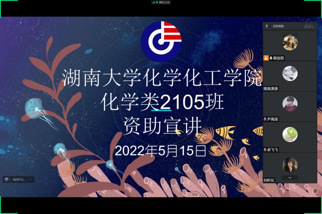化学类2105班在2022年5月15日下午16:00-17:00开展了以“资助育人,助力前行”为主题的资助政策宣传班会,此次班会以腾讯会议的方式开展,由爱心使者高佳丽同学主持。
