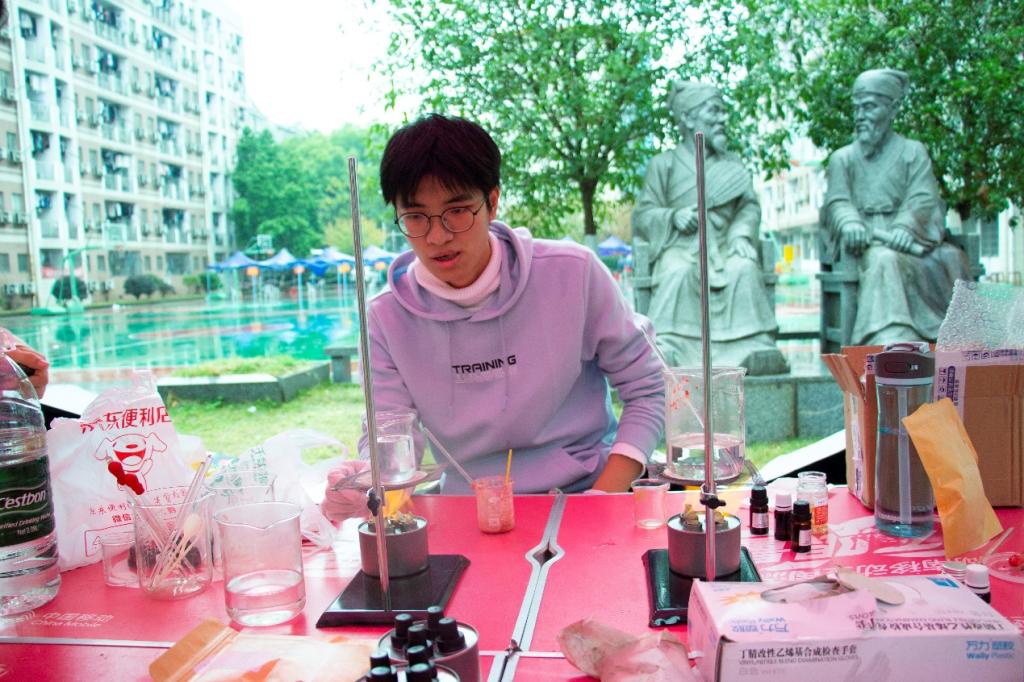 第九届化学文化节在天马篮球场举办。在本届化学文化节中,同学们通过一个个有趣的小游戏、一场场精彩的实验,带领同学们进入了一个奇妙的化学世界。本次活动包括游戏部分和实验部分,其中游戏部分包含“画出你心中的那个它”、“你是懂元素周期表的”、“袅语化箱”、“化了个化”以及“锦上添化”这五个游戏;而实验部分包括“油水熔岩”和“水果的密信”两个演示实验以及互动实验“唇釉简制”。
