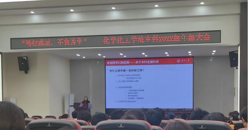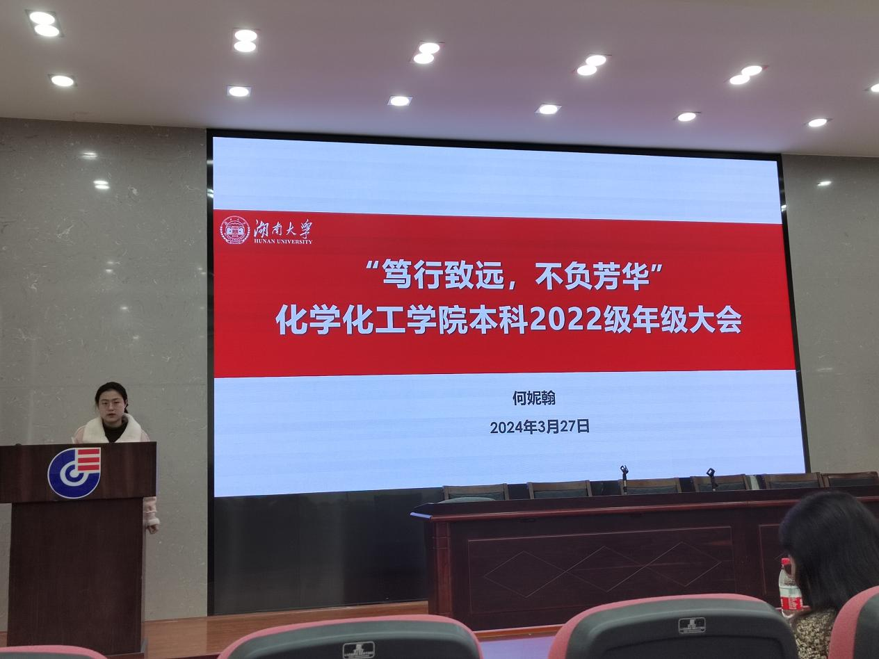 2022级本科生年级大会在新化工楼D区报告厅顺利召开。本次年级大会由阮筠萱同学主持,学院党委副书记李洪玉、本科2022级辅导员何妮翰和2022级本科生全体参与。