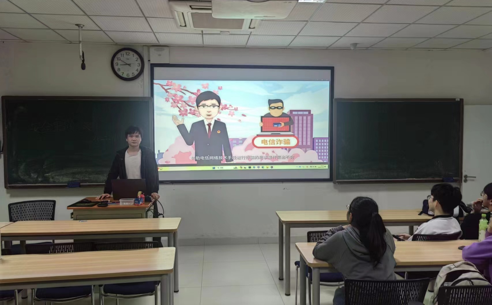 除了一些常见的安全问题,网络安全问题和财产安全问题也值得同学们的重视。网络诈骗时时刻刻发生在同学们的生活中,学生受骗损失大量财务的情况频发。班会举行过程中,主持人组织同学们一起观看了一段反电诈宣传片,用生动的图画,简洁的言语、深刻的实例调动同学们反诈积极性,并增强了同学们对网络诈骗的防范意识。