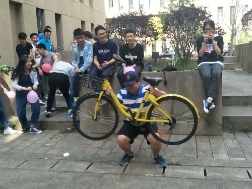 骄阳似火,热情依旧,紧接着进行第二个游戏——借东西。每个队伍派出一名代表,抽取一个数字,代表绕柱子转几圈,转完圈后抽取一张任务卡,完成任务卡上借东西的任务。刘王老师作为芬达队的代表,首个完成了借东西的任务,而雪碧队的夏智康同学抽到了“借5公斤以上的物品蹲起十次”的任务,于是他举着小黄车做蹲起,引得同学们“哄堂大笑”。