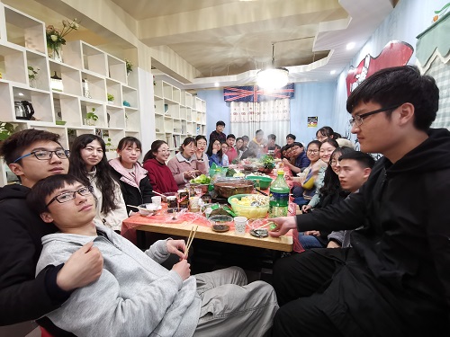 下午五点左右同学们齐聚嗨度轰趴馆,女生们开始放松玩耍,男生们则默默地去厨房洗菜。1个小时之后菜已洗净,一部分男生摆放桌椅碗筷,另一部分男生则开始制作火锅汤底,不一会儿一席丰盛的火锅菜肴便制作完成。在吃饭之前,班长叶一儒同学让所有女生闭上眼睛走到大屏幕前,倒数三下之后女生们同时睁开眼睛,展现在她们面前的是全体男生早已准备好的视频,视频里表达着男生们对女生的祝福和友谊之情。视频结束之后团支书将定制的蛋糕打开,上面插着一根爱心蜡烛和4根写着1601字样的蜡烛,象征着应化1601这个温馨的大集体,团支书点燃所有蜡烛,烛光点亮了整个房间,温暖着应化1601这个大家庭每一个人的心。吹灭蜡烛之后,大家齐聚一桌兴高采烈的享受男生们准备的丰盛的火锅,在欢声笑语之中吃完了这顿美味的晚餐。
