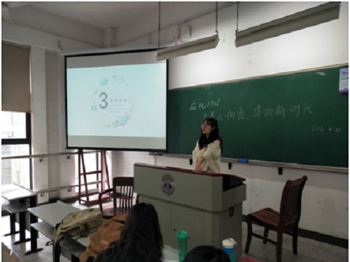 4月30日,活动正式于综合楼402展开,团支部为同学们介绍世界十大杰出青年之华人篇,感受青年奋起的力量,激励同学们趁着现在的大好时光有所作为,努力为社会发展贡献出自己的一份力量。并由部分同学交流他们的活动感想,畅谈他们对未来的展望和期待,同时说出它们心中五四精神的内涵以及未来他们将以什么样的姿态和行动展示五四精神,在不断的交流过程中获得收获和学习。