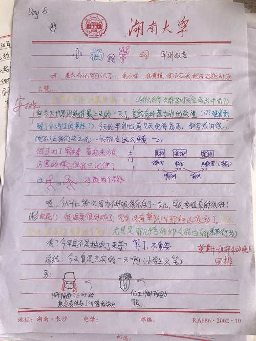 军训的同学们每天不仅要在军训场上接受训练、在寝室接受检查,还要将一天的心得体会写成日记交给班助。虽然最初同学们都是在勉强完成任务,但随着日子一天天过去,他们的日记也变得缤纷多彩起来。犀利的点评,幽默的文字,精彩的配图,几乎每一篇军训日记都能让班助们津津乐道。