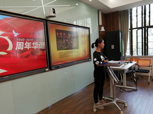 活动分为上午下午两场。928日上午10:30,全体同学到场后,新闻宣传委员组织大家观看《建国大业》影片405教室四面环绕8块电子屏幕,课桌周围插有国旗,图片、实物和立体的声音使同学们更好地沉浸于对建国伟业的学习之中。电影放映结束后,同学们进行自由的回顾与思考。