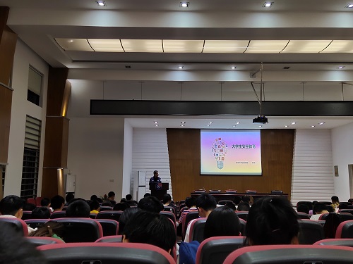 然后,程警官分别从人身安全、财产安全、消防安全、交通安全和国家安全五个层面进行讲解。他强调,大学生人身安全应当引起每位新生的警惕,永远把人身安全放在首位,“生命不保,何谈学习。”就人身安全,程警官分别从心理精神问题、打架斗殴、游泳溺亡、食品安全、毒品防范等方面进行深入剖析,并以此为鉴,对新生提出以下建议:一.出现心理疾病应及时找心理医生咨询;二.同学之间出现矛盾应积极解决,不要因小事酿成大祸;三.游泳活动一定在安全区域进行,尤其饮酒后不要下河游泳;四.注意食品安全,警防食物中毒;五.严守毒品防范底线。
