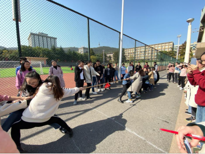 十一月的微风,天气仍有丝丝凉意,但前来助威加油的人仍不在少数,使赛场氛围十分热烈。比当比赛开始的哨声响起,队友们全都紧握绳子,憋足了劲把绳子往后拉。同学们在旁边为自己的班级加油呐喊着,每个人都恨不得抓起绳子跟选手一起努力。使得整个场面既激烈又温馨。