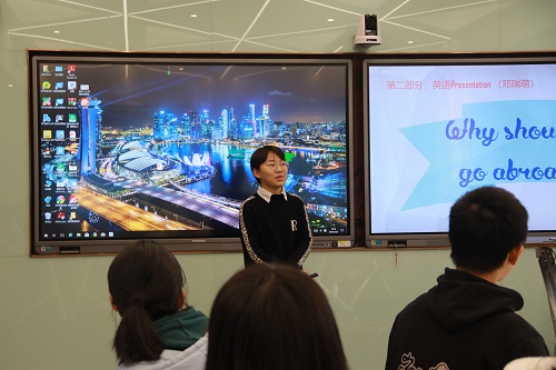 随后,在班级同学风采展示环节,邓瑞萌同学以Why should we study abroad?为题作了英语风采展示。