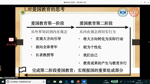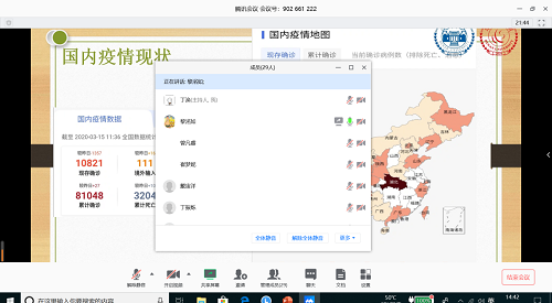 2020年3月15日14:30~15:30,化工院理科试验班在腾讯会议平台举行“共抗疫情,爱国力行”主题班会。活动的目的为向理科试验班全体同学普及新冠病毒肺炎疫情的相关知识及全球局势、引导同学们对疫情局势和如何报国的思考,以及唤起同学们的家国情怀。本次班会由班长丁涣策划和组织,袁知秋和黎洺如同学主讲,班主任刘松老师和理试1901全体同学参与。
