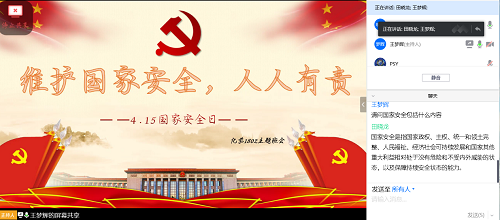 为更好了解国家安全内涵,明确大学生怎么维护国家安全。4月13日下午三时,化学1802 班全体同学通过腾讯会议举办了以“维护国家安全”为主题的班会,班会由班长王梦辉主持,组织委员陈伟协助举办。