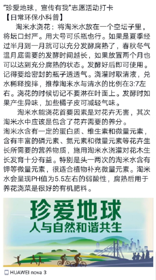 活动第一期报名,不到半小时就已招满宣传志愿者。本次活动主要通过志愿者利用网络媒体QQ,微信等进行图文宣传,紧紧围绕“珍爱地球,人与自然和谐共生”这一主题,自主选择专题板块进行宣传。第一期的活动专题分为三个部分:培养环保小习惯,科普环保小知识,环境治理成功典范。活动第二天就收到30余篇优秀作品。在“培养环保小习惯”专题中,化工院同学以数据形式向大家展示了一度电的些作用,通过化学原理介绍了淘米水浇花的好处;在“科普环保小知识”专题中,同学们图文并茂地介绍了世界地球日的创立背景,科普了环保中的冷知识如网购背后惊人的碳排放,各国制定的“怪异环保法”;在“环境保护成功典范”专题中,同学们介绍了实名制矿泉水的两会提案,稻壳谷绿色轮胎等等。除此之外,还有同学们自创专题“宇航员视角下的地球”带同学们领略俯瞰地球之美,以及垃圾分类冷知识教会同学们学习奶茶杯,粽叶的“垃圾属性”。