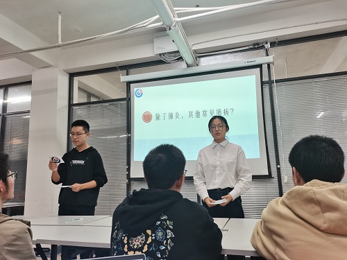 主持人张佳伟、张一诺以“你对肺结核了解多少”的问题作为本次班会的开头,拉开了本次班会的序幕。接着,主持人用一段幽默又富有知识的动画短片向同学们介绍了结核病的发病原理、历史上人们对结核病的看法、当今结核病的治疗手段以及如何预防结核病。同学们在观看动画短片的同时,也了解学习了相关的知识。 随后进行班会课最精彩的部分:班长周钲深向同学们现场展示艾滋病的自测。他向同学们介绍了自测盒的组成成分和自测原理。同学们的积极性被调动起来,好奇地看着周钲深同学的展示与分享。周钲深同学一边讲解一边演示,在自测操作的过程中,同学们亲眼观看,更好地了解有关艾滋病的自测。