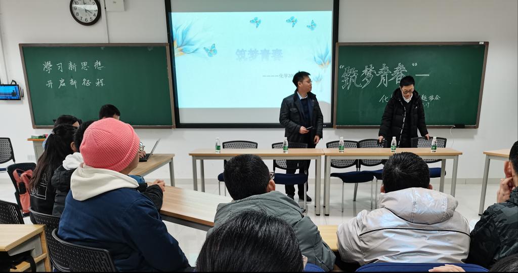化学类2006班于研究生院楼顺利开展“筑梦青春”主题班会。朱日龙、楚宗霖、张小华、李铮、霍甲五位老师出席此次班会,与学生进行亲切友好的讨论与交流。
