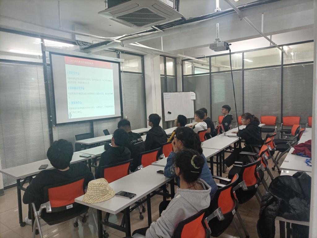 本次资助宣传讲座由团支书叶春景主持与讲解。讲座第一项,叶春景通过PPT向同学们展示了高校学生资助相关政策,从国家奖学金、国家励志奖学金、国家助学金、国家助学贷款、生源地信用助学贷款、勤工俭学、色情导航