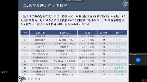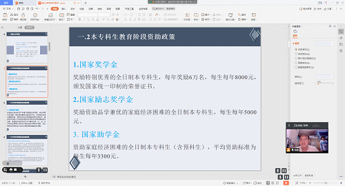 首先张烨同学详细讲解了我校资助工作背景及本专科生教育阶段资助政策。我校的资助工作自创立以来,一直在不断进步,其中资助投入每年都在大幅增加,资助政策体系在不断完善,资助管理也在不断规范。规范了包括1.国家奖学金;2.国家励志奖学金;3. 国家助学金;4.国家助学贷款;5. 服兵役高等学校学生国家教育资助;6.基层就业学费补偿贷款代偿;7.师范生公费教育;8. 新生入学资助项目;9.勤工助学;10.绿色通道;11.校内资助等资助流程。