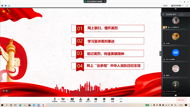 本次活动由化学类1904班团支书许华宇同学组织与主持。除了5名同学因个人原因无法参加活动外,其余17名同学全部参与。本次活动分为四个部分,分别是“网上祭扫,缅怀先烈”、“学习宣讲英烈事迹”、“铭记英烈,传递英雄精神”及“网上云参观中华人民抗日纪念馆”。