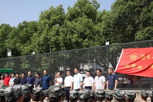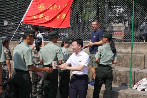 2021级全体本科新生在院旗前集合完毕,院长张晓兵老师代表学院发表讲话,对全体新生、教官、班助们表示了关心慰问,鼓励新生们要坚持训练,努力战胜困难,随后与其他前来慰问的领导老师们一起为新生发放清凉奶茶,院党委副书记潘刚峰老师代表学院亲自为教官们送上奶茶并表示感谢。与此同时,同学们也一齐向学员前来慰问的老师们表达了衷心的节日祝福,感谢老师们的亲切关怀。