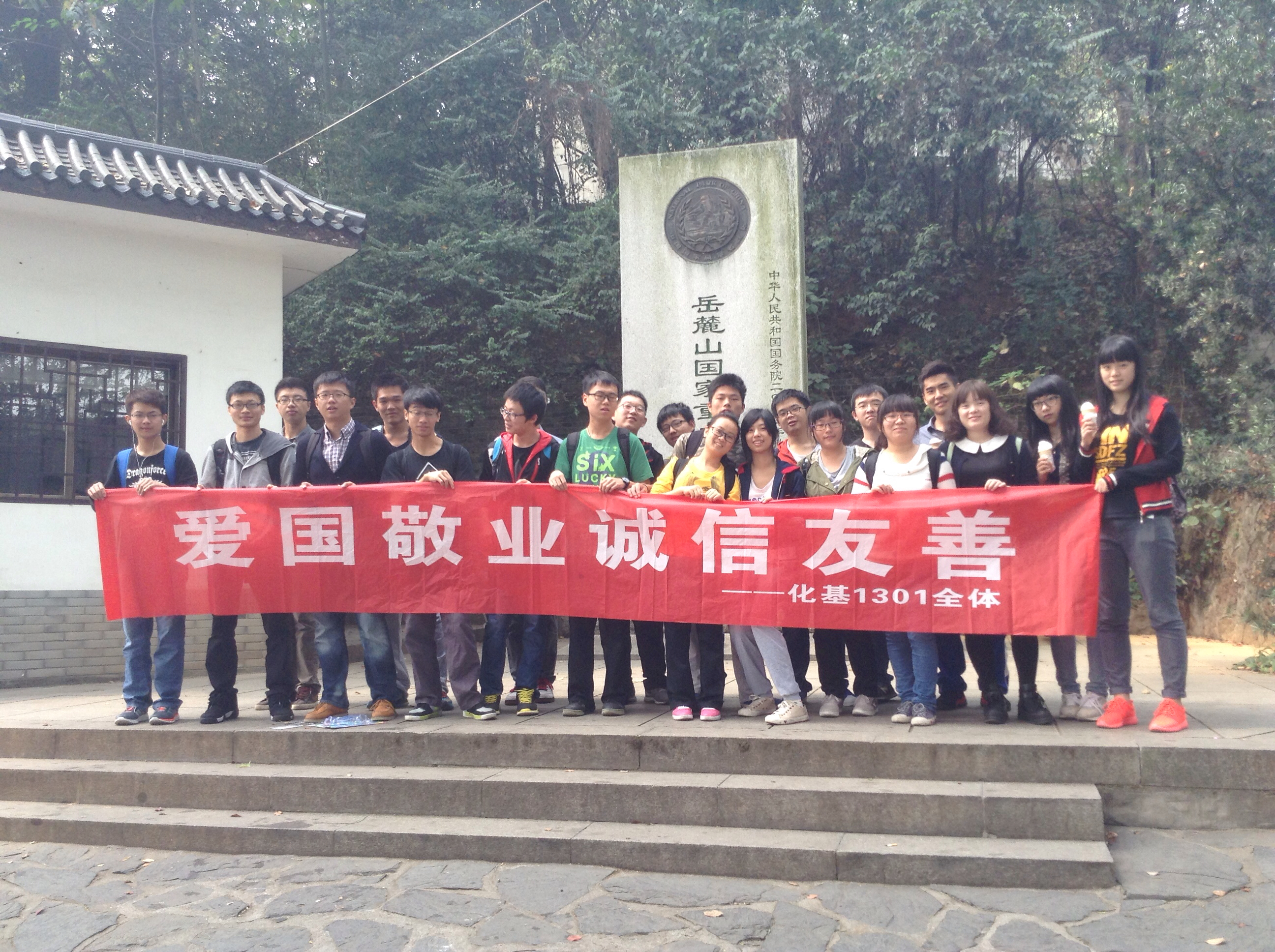 13届化学基地班在复临舍召开了以社会主义核心价值观为主题的班会,随后转战岳麓山脚开展了一系列的爱国主义的宣传活动。