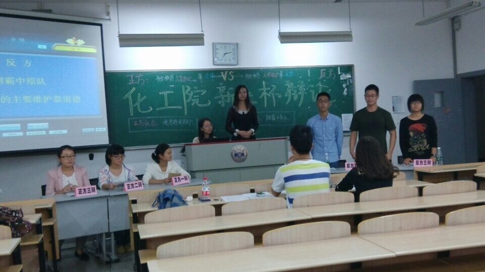 比赛的第一场是化学四班对阵化工一班,正方化工一班的辩题是社会秩序的主要维护靠法律,而反方化学四班的辩题则是社会秩序的主要维护靠道德。比赛在双方辩手各自进行完自我介绍后正式开始,首先是双方一辩的立论,正方说出了法律对社会秩序具有预防、监管和惩戒的作用,而反方则从道德的广泛性、持久性、预防性,以及道德是法之根本,进行己方立论,有理有据,逻辑清晰。接下来,盘问环节开始了,双方辩手唇枪舌剑的交锋,以自己准备的犀利的问题,不断抛向对方辩友进行攻击,意图找出对方漏洞,从对方的回答中证明自己的观点,十分激烈。而在逻辑清晰地盘问小结后,一场辩论赛最精彩的环节——自由辩论也开始了,双方就社会秩序的主要维护是靠道德还是靠法律,展开了激烈的辩论,起初反方打出了维护的定义,而正方也给予了相应的回击,双方来来回回,势均力敌。然而随着自由辩论一点一点的进行,渐渐正方找准了自己的节奏,一个一个的打出了自己的观点,而反方却没有有效的反击,最终陷入了被动。最后,由双方三辩进行总结陈词,为我们总结了整场辩赛他们的观点和对方的漏洞。