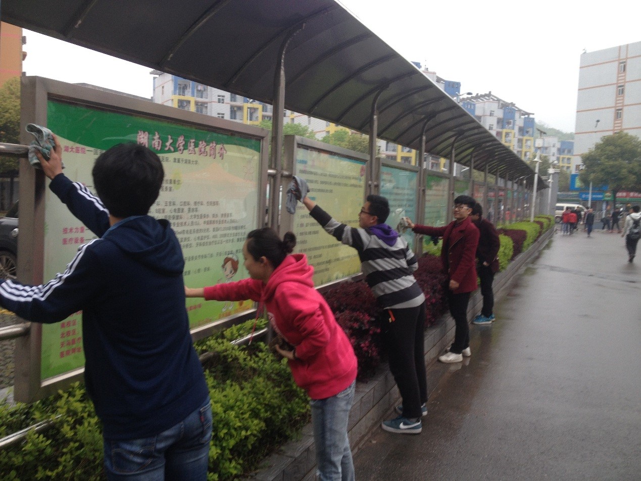 在活动第一部分,大家从寝室里带上干净的抹布一批一批赶到天马园区门口,开始对宣传窗的清洁工作。宣传窗是园区同学获得学生活动消息的一个重要途径,也是展示大学生精神风貌与青春风采的平台。因此大家决定本次活动从清洁这里开始。清洁过程中,大家分工合作,互相帮助,认真地对橱窗角落等平日清理不仔细的地方进行了细致的清理。