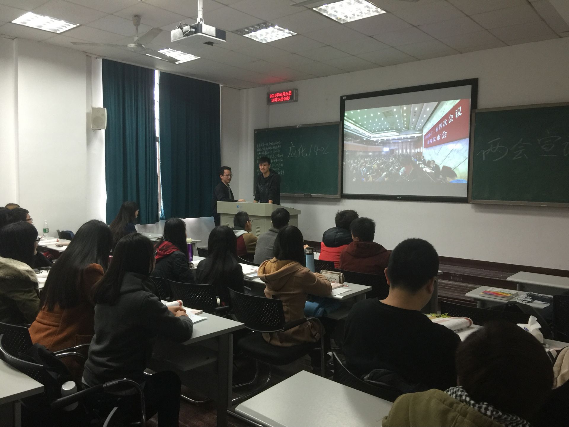 而之后预备党员车继兴同学给大家解答大家关于“两会”的众多疑问,大家针对两会提出了很多的问题,如“大学生关注两会有意义么”“2016脱贫计划是如何进行的”等。另外,蒋瑶同学也分享了自己的观点,“关注两会,关注政治,提高同学们的思想修养,增强广大学生对时事的关注,提高大学生的政治觉悟,弘扬“两会”精神,把 “两会”精神与现实工作、学习结合起来对大家来说是一件非常有意义的事情。”车继兴同学的回答让大家对两会有了更进一步的了解。