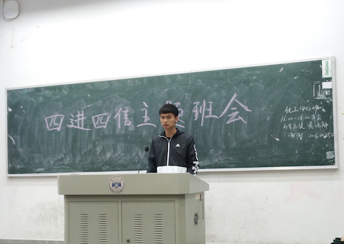 班会开始,刀旋同学为同学们介绍了“四进四信”提出的背景及主要内容,即以“四进”为手段,以“四信”为目标,通过“进支部、进社团、进网络、进团课”,组织开展有形化、经常化的工作和活动,引导帮助广大青年学生和高校团学干部进一步牢固树立对党的科学理论的信仰,坚定走中国特色社会主义道路实现“中国梦”的信念,增强对党和政府的信任,增进对以习近平同志为总书记的党中央的信赖。