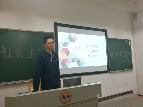 活动伊始,团支书着重为大家介绍了社会主义核心价值观中的关键词及其内在含义。他还从党的十八大召开到现在为止,介绍了社会主义核心价值观的提出与演变,并为同学们初步讲解了社会主义核心价值观在中国梦的实现与社会发展中的重要意义与作用。