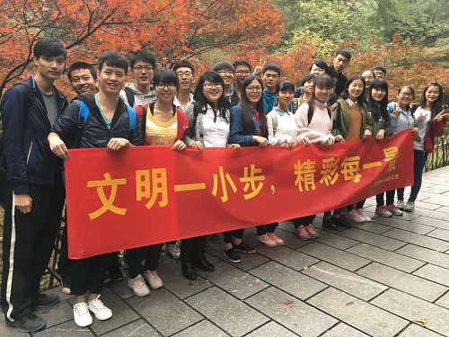 化学1404班全体同学在东方红广场集合完毕,团支书欧阳普凡同学带领大家一起前往爱晚亭,开始本月的团日活动。
