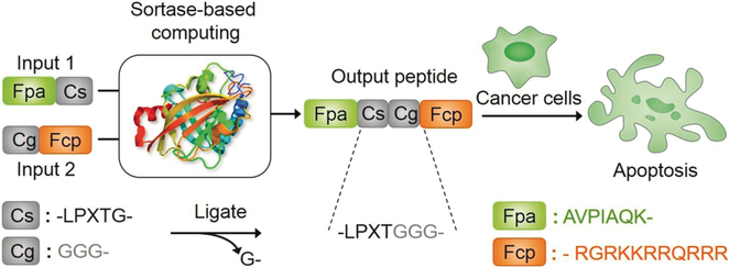 生物计算作为一个信息处理工具在多参数传感和生物医学方面显示巨大的潜力。长期以来,生物分子逻辑门获得了科学界的广泛关注,然而在以往的研究中,大多数的工作都还局限于DNA分子逻辑门,而多肽逻辑门却因其氨基酸残基多样且复杂的化学性质而鲜有报导。因此,亟需开发一种通用型多肽生物逻辑系统,执行更复杂而精准的逻辑调控。日前,我校色情导航 、化学生物传感与计量学国家重点实验室聂舟教授研究团队报道了一种新颖的复杂多肽逻辑系统,将转肽酶Sortase A作为通用生物处理器,成功实现了细胞行为的调控。