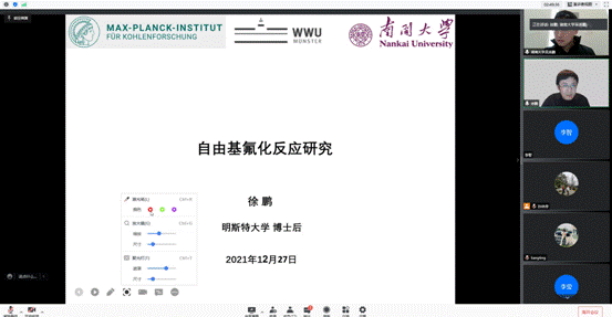德国明斯特大学徐鹏博士的学术报告题目为《自由基氟化反应研究》,研究工作主要集中在有机氟化学方法学开发以及复杂药物活性小分子后期官能团化。