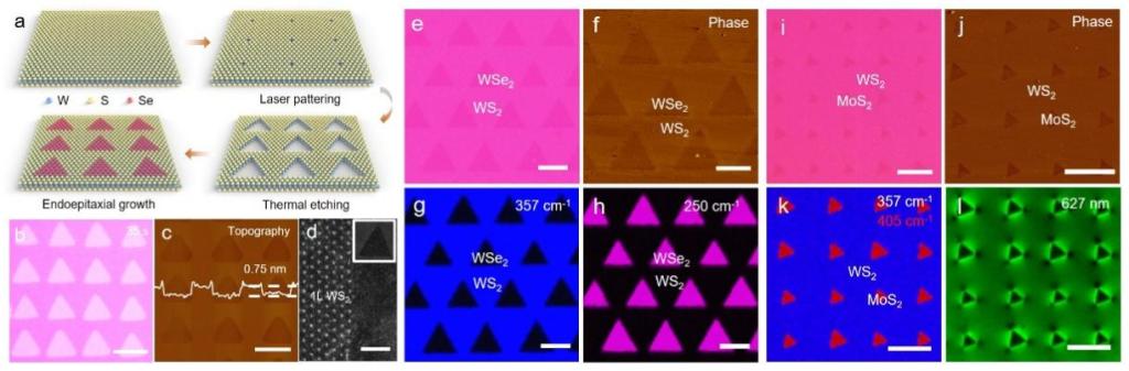 实现二维材料在新一代集成电路中的应用关键在于制备高质量二维材料单晶和空间组分、电子结构高度可调的二维异质结构。经过十几年的研究,已经成功制备了米级单晶石墨烯、分米级单晶六方氮化硼和晶圆级单晶过渡金属硫族化合物。二维半导体面内异质结阵列是集成具有不同电子和光电特性的二维半导体模块的关键步骤,能够实现丰富的异质构成并用于高密度超薄器件,为未来电子学发展提供全新可能。制备单层半导体异质结阵列的关键在于实现二维材料的原子级精度的加工。然而,传统的光刻和刻蚀工艺容易在二维表面上造成不可控的残留和损伤,难以满足二维材料的加工精度要求,使得面内异质结阵列结构难以实现。因此,发展全新的原子级加工手段实现阵列化面内异质结迫在眉睫。