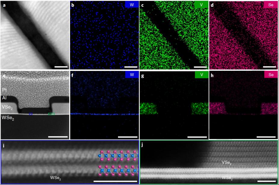 具体地,段曦东教授课题组在二维半导体WSe2沟道上直接通过化学气相沉积工艺(不进行直接光刻和金属化工艺以及带有机胶的转移工艺)制备了二维金属VSe2,形成双层WSe2晶体管的理想的范德华接触,极大地降低了接触电阻。在双层WSe2上范德华外延VSe2时,VSe2晶界处在冷却过程中由于VSe2和WSe2的热膨胀系数不同,晶界被拉开而自然形成亚100纳米间隙,自然定义了沟道长度。这样无需常规光刻或金属化工艺即可在原子级薄厚度的二维半导体材料WSe2上获得超短沟道(最短至6nm)晶体管。。扫描透射电子显微镜研究表明,所得的晶体管结构保留了原始的双层WSe2通道,并在双层WSe2与合成的VSe2触点之间具有原子清洁的界面,没有明显的污染或缺陷。对晶体管性能进行测量表明所得的低于100 nm的双层WSe2晶体管可以在1.0 V左右小的偏压下达到1.50 mA μm-1的超高Ion。特别是,在室温下,在沟道长度为20 nm,厚度为1.3 nm的双层WSe2晶体管中,获得了Ion为1.72 mA μm-1的单双层二维半导体晶体管开态电流密度的世界纪录。其中的Ron仅仅为0.50 kΩ·μm。该研究突破了二维晶体管的性能极限,首次证明了原子级厚度的二维晶体管在Ion方面与硅晶体管相比具有竞争优势,展示了二维半导体材料对于未来电子产品的巨大潜力。