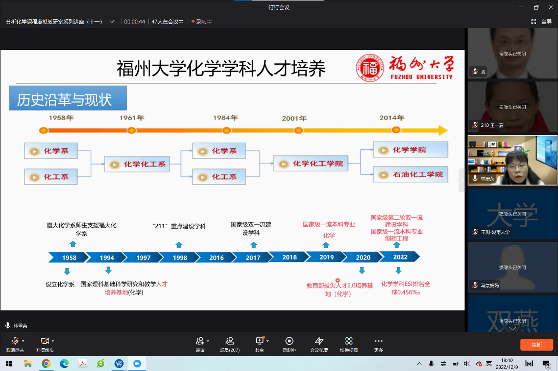 宦双燕教授主持,来自福州大学的林翠英老师为主讲嘉宾。林翠英老师是国家线上一流本科课程《分析化学》和福建省线上线下混合式一流课程《分析化学J》的课程负责人,她报告的题目是“思政融合的‘分析化学’混合式教学体系的探索”,参与本次虚拟教研室交流的有来自十余所高校的六十多位教师。林老师从福州大学化学学科人才培养、“分析化学”课程建设目标、混合式教学设计及实施、混合式教学成果四个方面做了详细报告。对“C3H3嘉锡教育理念”,即清醒的头脑(Clear Head),灵巧的双手(Clever Hands),整洁的习惯(Clean Habit)做了深入阐述,介绍了如何面向“C3H3”化学创新人才培养进行课程体系的建设,从基础知识、深度知识和广度知识三方面构建模块化知识体系,将线上教学资源融入线下教学过程管理中,将思政元素融入到教学内容中。教学中引入公共安全事件案例,培养学生的学科和专业使命感,同时让学生了解学院的科研创新成果为国家和社会做出的贡献,提升学生的自豪感。随后,林老师和与会教师做了教学经验的互动讨论,思政融合的“分析化学”混合式教学体系探索为化学学科创新人才培养提供了好的建设思路和借鉴经验。