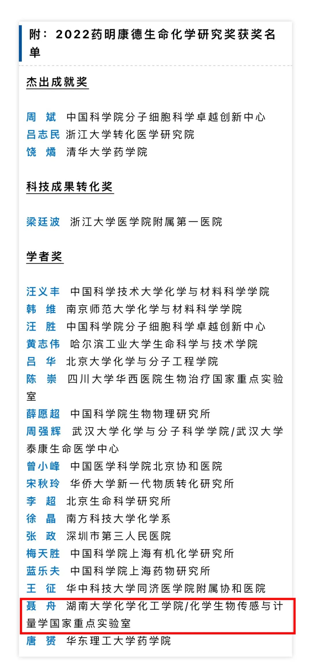 聂舟教授获得药明康德生命化学研究学者奖。