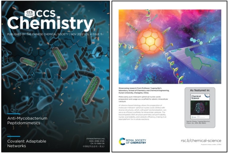 白玉罡课题组在2022年见刊的其他2篇封面/封底文章,左为中国化学会旗舰刊物《CCS Chemistry》封面,右为英国皇家化学会旗舰刊物《Chemical Science》封底。