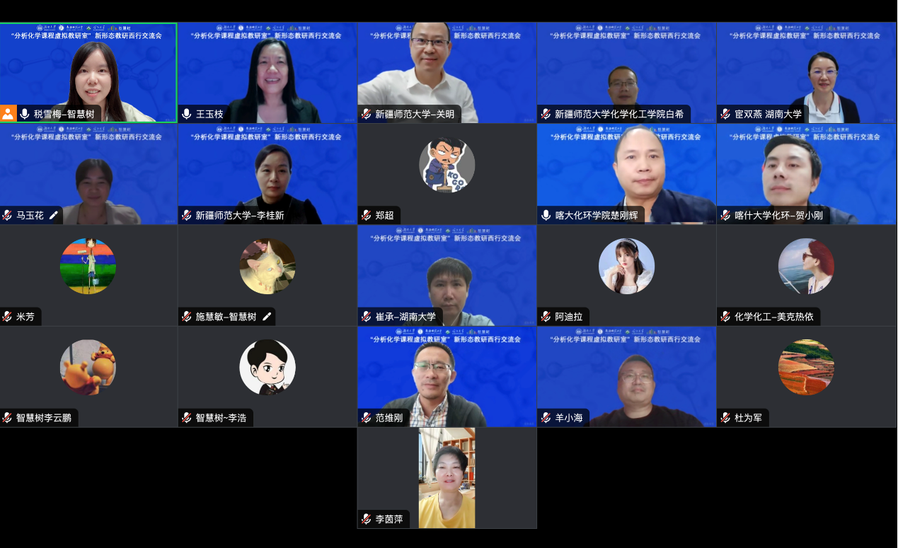 、新疆师范大学、喀什大学三校“分析化学课程虚拟教研室”新形态教研西行交流会顺利召开。来自三个学校的分析化学教学团队成员及智慧树网相关工作人员共计21人参会。会议由智慧树西行办税雪梅主持。