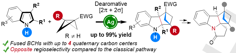 冯见君课题组报道了银催化吲哚与双环[1.1.0]丁烷去芳构化[2π+2σ]环加成反应,原子经济性合成双环[2.1.1]己烷并吲哚啉产物。利用银催化体系可在温和的条件下高效地实现N-无保护的吲哚与1,3-二取代的BCB底物的[2π+2σ]环加成反应,以高达99%的产率一步构建多达4个连续季碳中心,产物可以进一步衍生化构建复杂多环桥环体系。并且产物的单晶结构表明该环加成反应具有“反直觉”的区域选择性,即:环加成产物中吲哚的亲核性的C3位与BCB的亲核位点成键。这一现象表明银催化的[2π+2σ]反应经历了全新的反应模式。