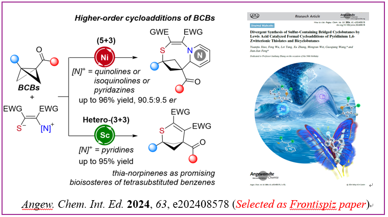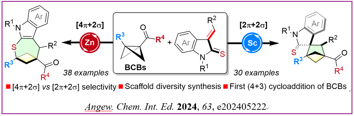针对双环[n.1.1]烷烃种类不丰富合成难度大的问题,冯见君教授课题组发展了双环丁烷的首例(4+3)环加成反应,并通过催化剂和底物调控实现了(4+3)和(3+2)反应,(5+3)和(3+3)反应的发散可控进行。在丰富双环丁烷环加成化学的同时,为新药研发中对苯环的三维生物电子等排体的刚性需求提供了丰富多样的“菜单”。上述工作在《Angew. Chem. Int. Ed.》上发表,并被主编选为Frontispiz文章。色情导航