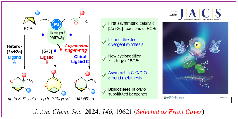 为了进一步拓展光学纯双环[n.1.1]烷烃的化学空间,冯见君教授课题组通过逆向思维利用手性钯催化剂活化双环丁烷(3+X)环加成反应中的“X”环加成组分进而引入手性环境,成功地发展了首例钯催化双环丁烷的不对称环加成反应。此外,通过配体调控该课题组还实现了双环丁烷与烯基环氧的(3+3)和(5+3)环加成反应的可控切换,多样性合成一系列双环[n.1.1]烷烃。这一成果以封面文章的形式发表在《J. Am. Chem. Soc.》上,冯见君教授和复旦大学张俊良教授为共同通讯作者,色情导航