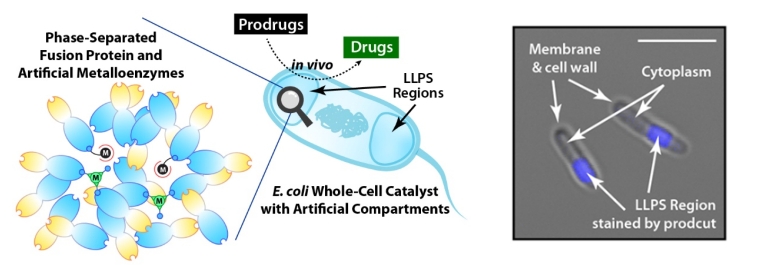 左:通过LLPS技术在大肠杆菌中创建人工隔室总示意图。人工金属酶与支架蛋白通过液-液相分离在大肠杆菌内形成人工隔室,创造出“庇护所”以提高其内部的人工金属酶的催化效率,由此构建出了具有高性能的大肠杆菌全细胞催化剂。在体内环境中,这些全细胞催化剂能够在特定位置将前药(Prodrugs)转化为活性药物(Drugs)。右:显微镜图像显示全细胞催化“庇护所”中经人工金属酶催化生成的荧光产物(蓝色)。