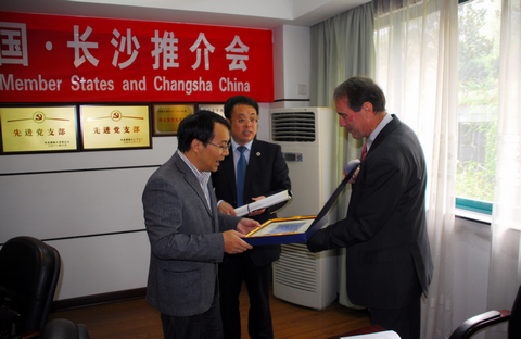 隆重举行,我校校长助理何益斌教授、国际合作交流处处长左权文教授代表学校参加会议并致欢迎辞。期间,欧盟及来自法国与德国驻华大使馆的三位参赞与长沙及周边地区高等院校、科研院所和科技企业的代表,就可能展开的科学技术研究展开了深入地交流。在科学技术研究领域,中欧双方有着共同的发展理念:创新、绿色和可持续发展。双方希望能通过广泛的科技合作,共同寻找合理的科学技术发展道路,创建中欧科技合作新局面。