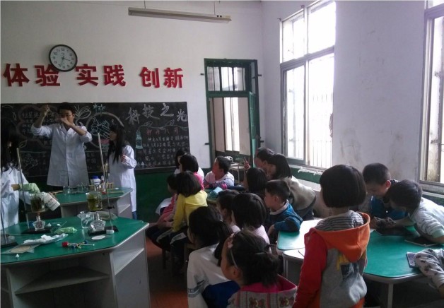 由于实验设施的不完善或者老师的不重视,很多时候,书本上的演示实验老师都只是简单地解释一下,并没有在课堂上给学生们演示。樟树门小学的学生们只能通过想象来完成实验的现象。在了解这个情况后,化工院的青志协决定利用自己的专业优势,让这些农民工学校的孩子们面对面地接触科学实验。