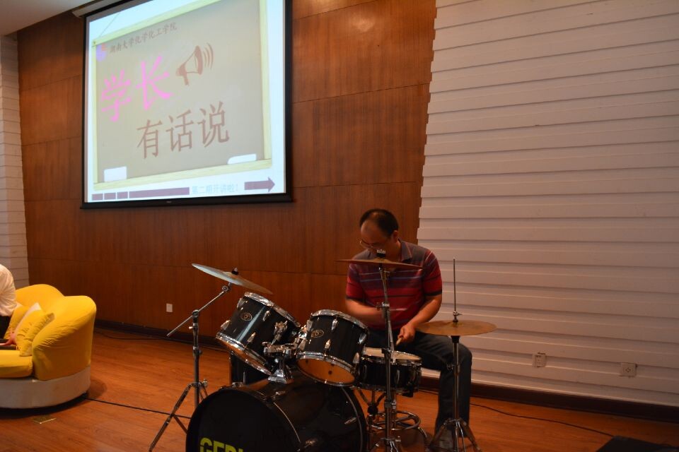 嘉宾一进场,台下便爆发出阵阵热烈的掌声,更有两位同学上台献花表达对学长们的敬爱与欢迎。访谈开始后,吴天忍首先和学长们聊起了大学生活。当问到学长们对大学的印象时,两位学长竟相互爆料好不幽默。蒋学长称谭学长大学时是一个文艺青年,虽然专业是化学但是经常积极参与学校的文艺活动。而谭学长则爆料蒋院长上大学时是一个大学霸,经常穿梭于各个教学楼。场下同学联想到蒋院长的种种科研成就,不禁心中又对他敬佩几分。知道谭学长大学时积极参与学生工作时,吴天忍便问谭学长,作为学生会干部学到了什么。谭学长说起他大学时很文艺,当时管理校艺术团,结识了很多朋友,他认为在这些经历中很好的锻炼了自己与人交际的能力以及处理事情的能力。讲到这里,谭学长还为大家表演了一段架子鼓,风采不减当年,引起台下阵阵欢呼。