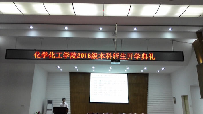 伴随着庄严肃穆的国歌声,典礼正式开始。接下来就是由院党委书记王玉枝教授致欢迎辞,她首先对考入湖大化工院的240多名16级新生表达了衷心祝贺和热烈欢迎。不仅如此,王书记还在欢迎辞中提出了几点建议与同学们共勉。最后王书记用韩愈的一句话“业精于勤,荒于嬉;行成于思,毁于随”激励同学们在大学四年里努力学习,奋发向上,在化工院书写自己的璀璨人生。