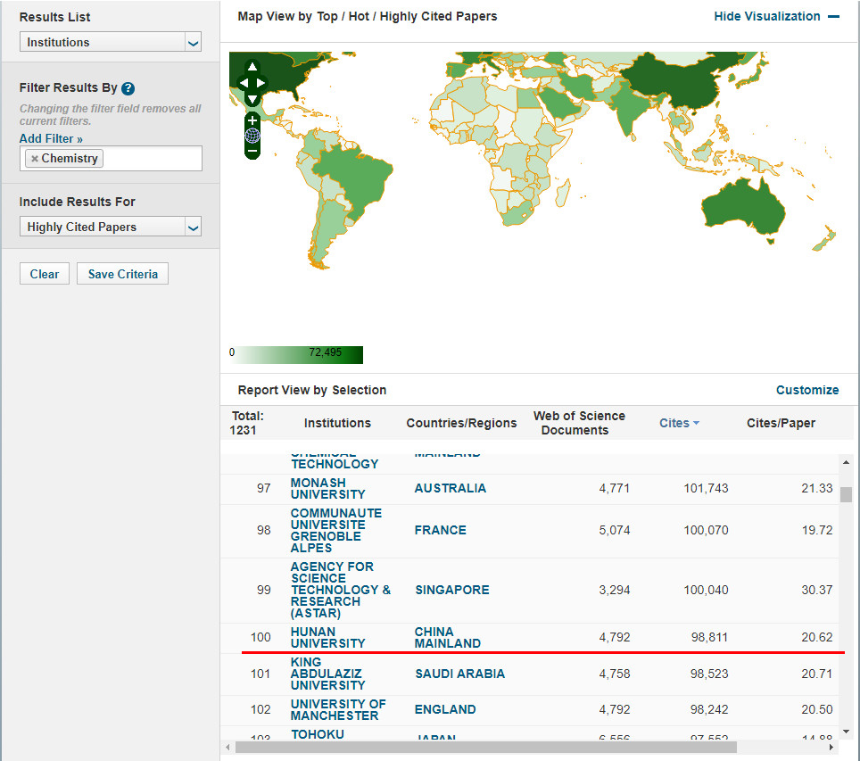 化学学科共发表WOS论文4792篇,被引频次为98811次,较之201905期被引频次增加显著,增加了5004次。在进入化学前1%的1231个机构中排名100位,首次进入全球化学机构一百强,标志着色情导航
