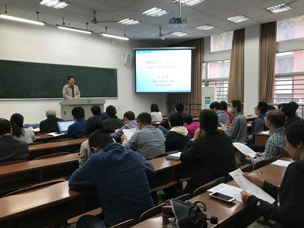 首先,化学生物传感与计量学国家重点实验室副主任羊小海教授做了“随风潜入夜、润物细无声——浅谈人才培养中思政教育的引入”的专题党课报告。他从中国共产党人的初心和使命,培养什么人、怎样培养人和为谁培养人的问题入手,提出尊重教育规律,创新教学手段,不喊口号、不翻本本,提炼文化基因、凸显现实意义,融入理想信念,培养正确三观的教育理念。随后,他结合分析化学的教学实际,以“中国银”的兴衰、飘落的银杏叶、茶水又“发炎”、大众汽车的“排放门”、凯氏定氮法“背锅”和分析化学助力“甩锅”六个教学案例加以示范,如何挖掘实际案例背后所隐含的思政元素,给大家展示了如何将思政教育融入到实际课程教学中,寓价值观引导于知识传授之中,将课程小课堂同社会大课堂结合起来,对学生进行积极引导。