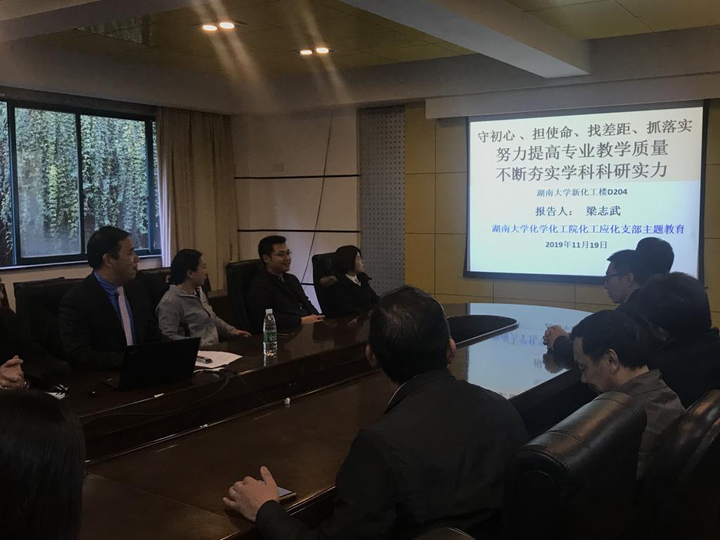 党支部全体同志在学院新楼D区204会议室开展了党政学习交流。会上,副院长梁志武教授作了《守初心、担使命、找差距、抓落实-努力提高专业教学质量,不断夯实学科科研实力》的专题党课。梁志武带领大家一起回顾了学院发展历史,以及化工应化专业的发展现状,并指出正是由于一代代老师和前辈们 “不忘初心”的努力和“牢记使命”的责任感,才有了我们现在色情导航