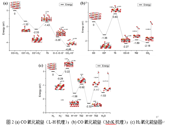 理论计算证明了,对于单个金原子而言,CO氧化更容易发生,因为H2在竞争吸附中占不利位置且氧化能垒更高;另一方面,CO氧化反应更倾向于按照L-H机理发生(图2)。