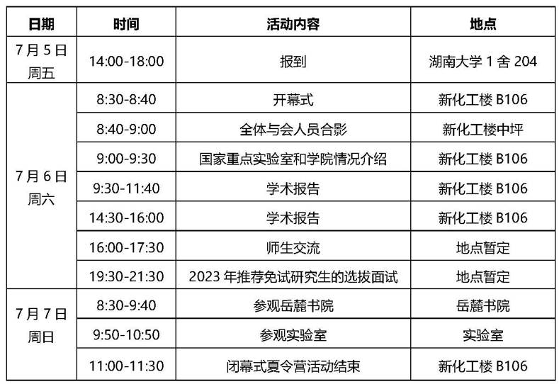 2.材料提交。网上申报成功后需提交纸质材料。请将申请材料按顺序一并装入A4大信封,信封正面注明:“湖南大学**学院夏令营申请”,以及网报系统生成的申请编号、申报专业、姓名、所在学校。请将纸质材料寄至如下地址: