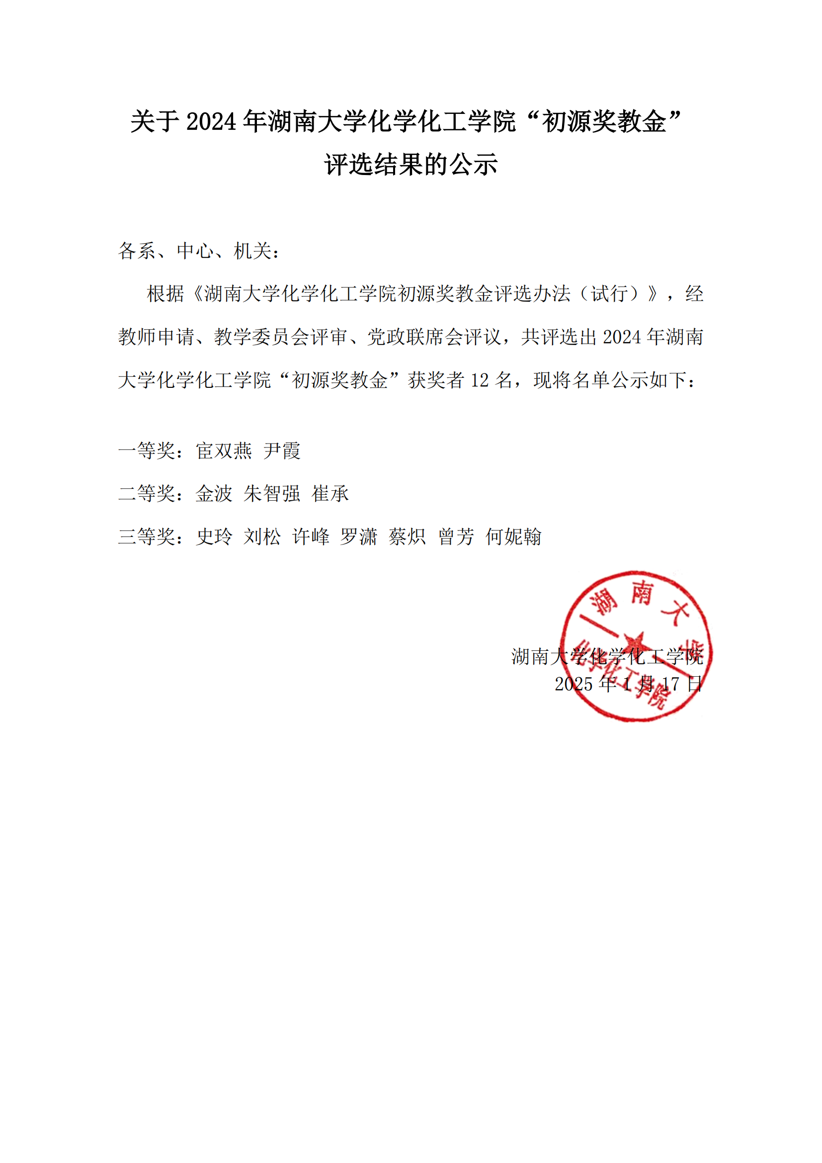 关于 2024年色情导航 “初源奖教金评选结果的公示